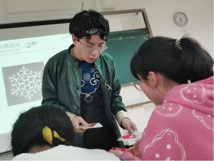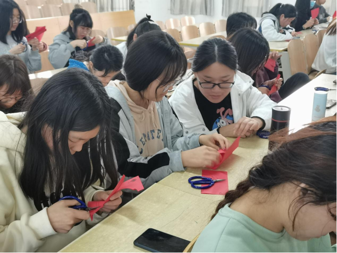 活动伊始,梁少华首先解读了“非遗”的概念,以有奖问答的形式与同学们展开讨论。随后,梁少华系统介绍了剪纸的种类、形式和文化底蕴,现场展示了多种剪纸形式,大大激发了同学们对剪纸的兴趣。纸上得来终觉浅,在同学们掌握基本理论方法后,梁少华分发剪纸模板和剪刀,引导同学们对折纸张、仔细构思,按照步骤和方法孵化一个个惟妙惟肖、栩栩如生的作品。
